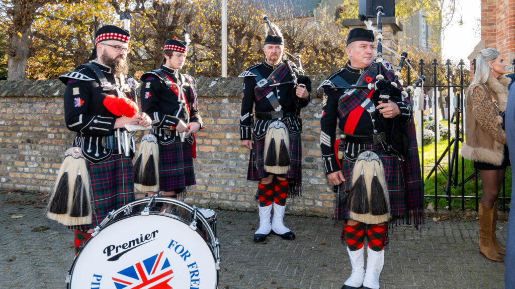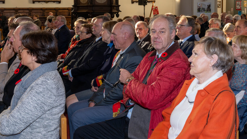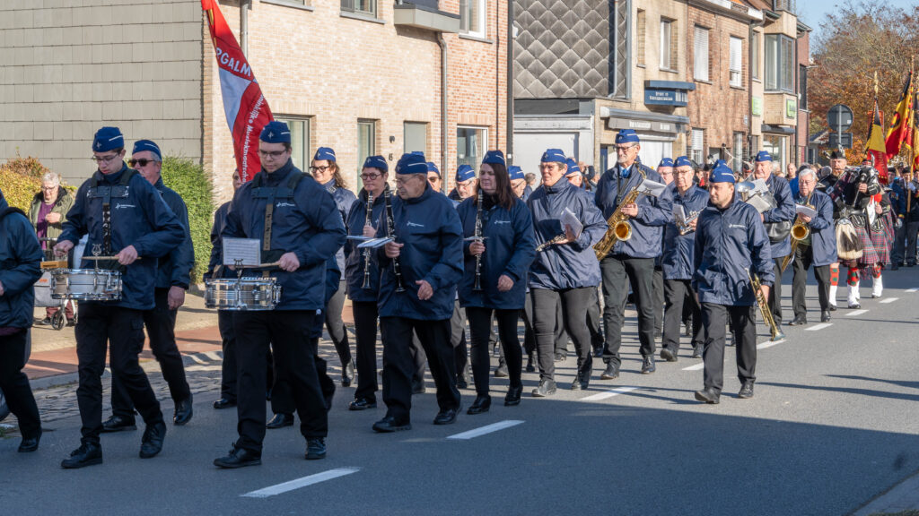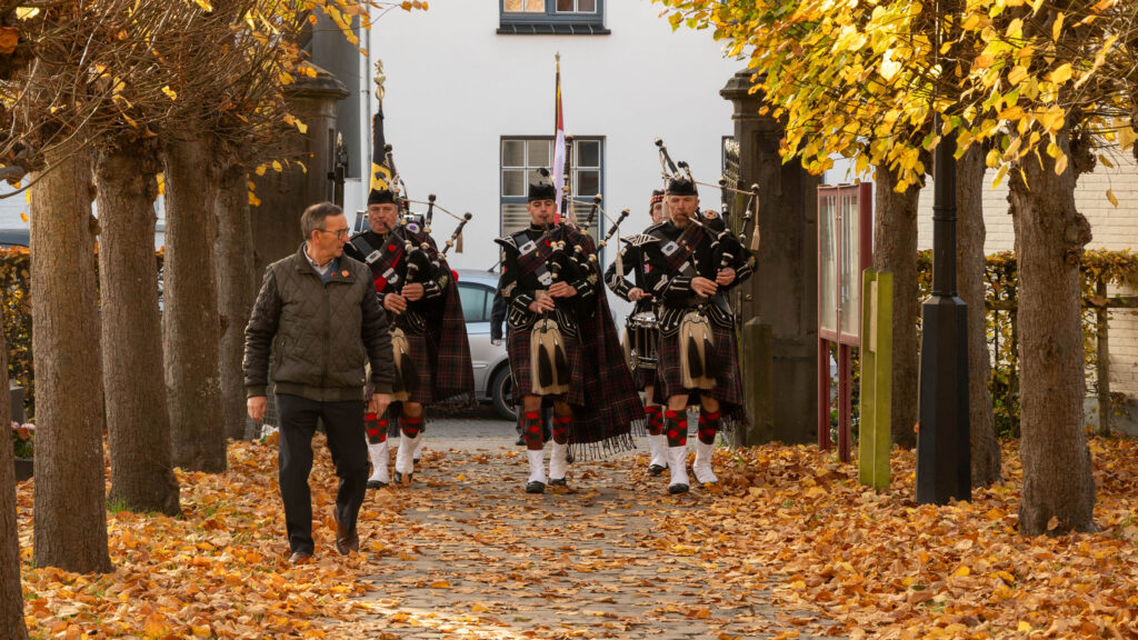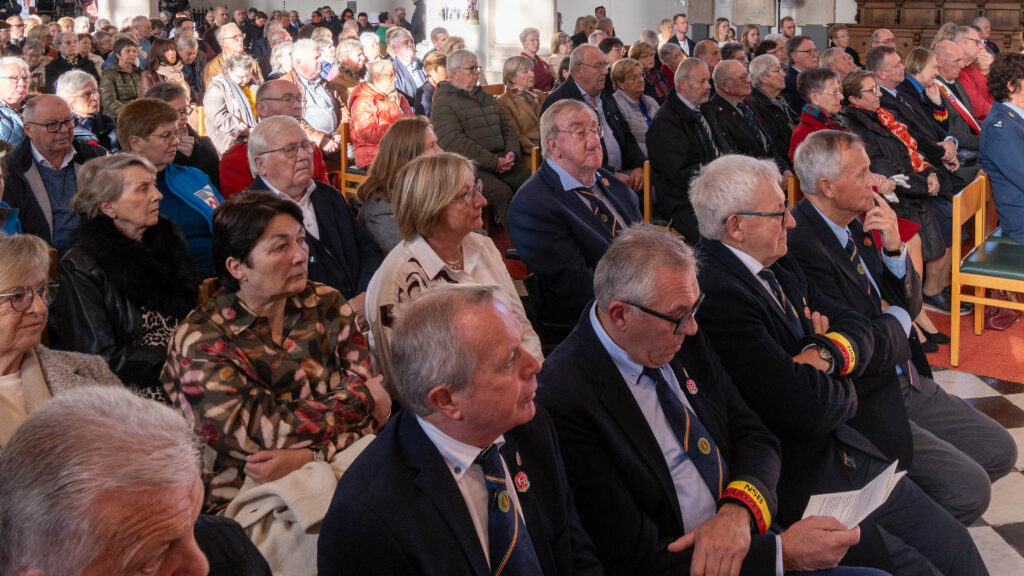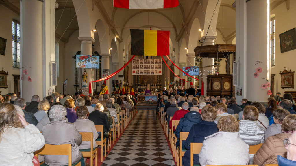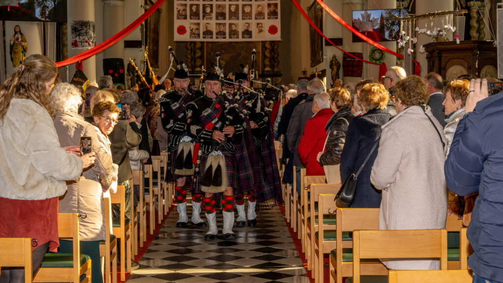 Onder de begeleiding van de Flanders Memorial Pipe Band, de vlaggen van de vaderlandslievende verenigingen en de plaatselijke verenigingsvlaggen begaven we ons naar de Sint-Pieter-in-de banden Kerk.
