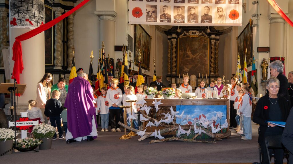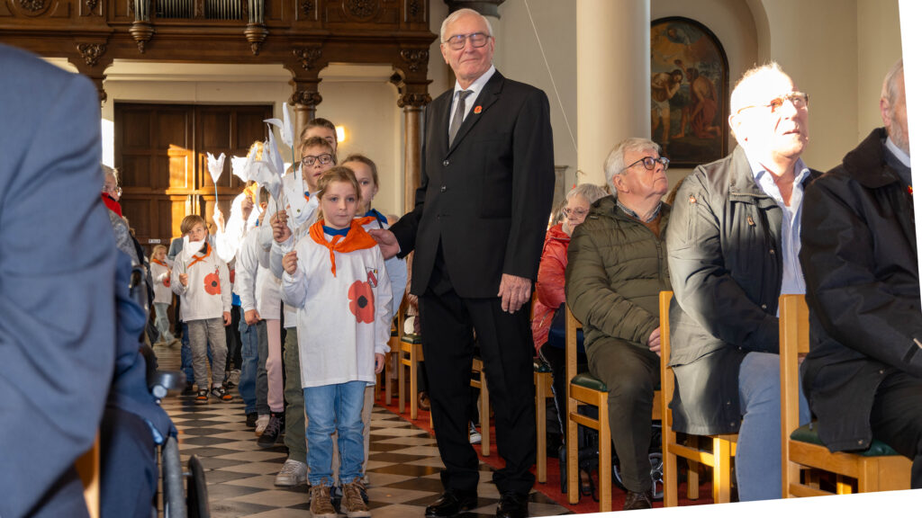 Terwijl de namen van deze oorlogsslachtoffers werden voorgelezen, werd voor het altaar door de kinderen een vredesduifje aangebracht. De om en bij 375 aanwezigen in de kerk waaronder kinderen van onze basisscholen ‘De Bijenkorf’ en ‘De Lenaard’ en onze KSA Sint-Lenaert, genoten van een serene en stemmige eucharistieviering dito herdenkingsplechtigheid.