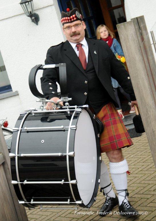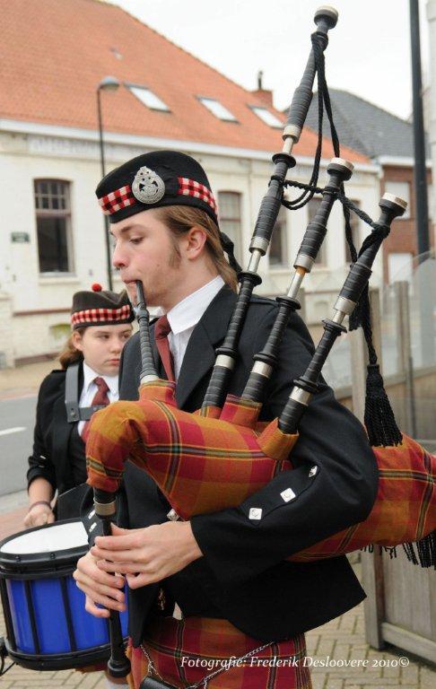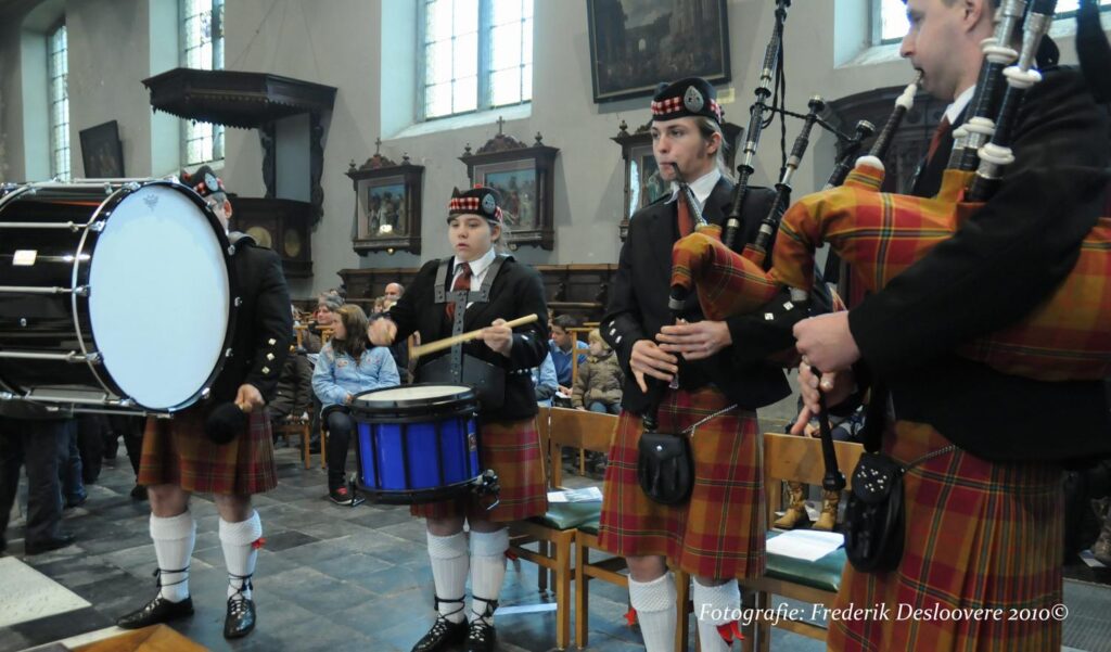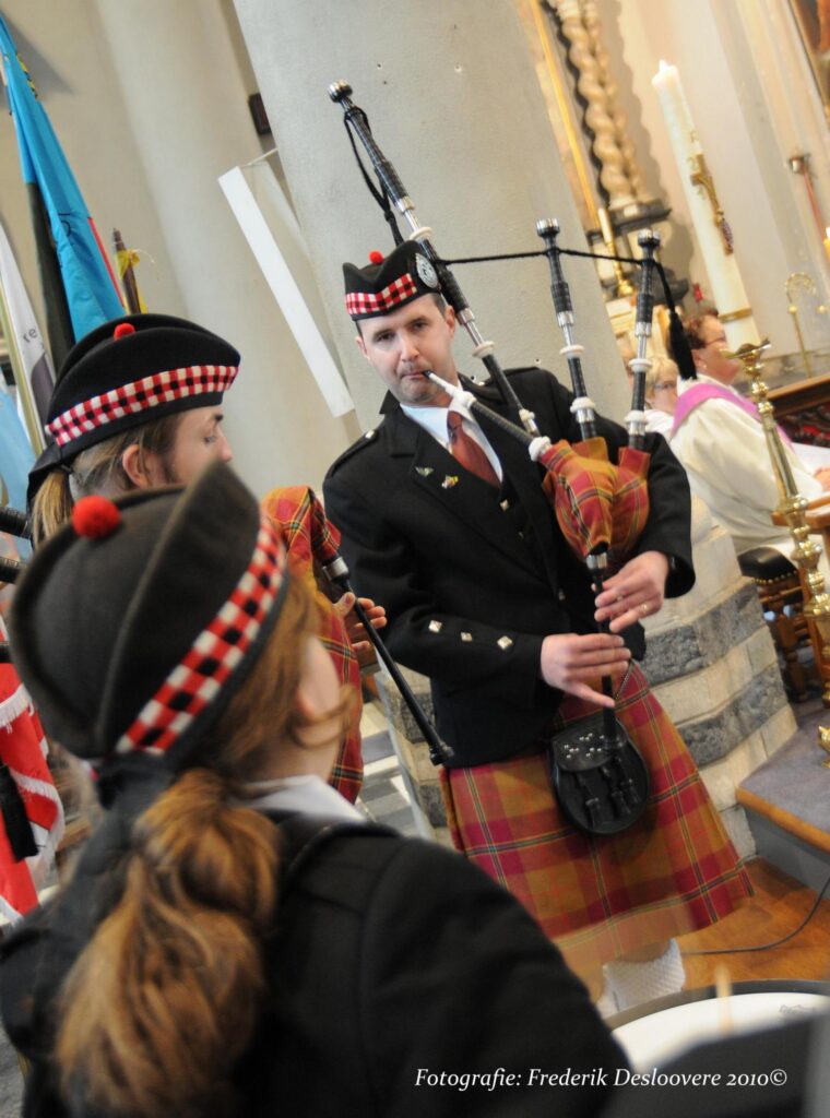 Het herdenkingsfeest begon reeds ‘s morgens om kwart na negen met een optocht door de Sint-Lenardstraat , richting kerk, onder de begeleiding van de Passchendaele 1917 Pipes en Drums, Piperband. De trotse kleurrijke verenigingsvlaggen lieten zich bewonderen onder de strakke wind.