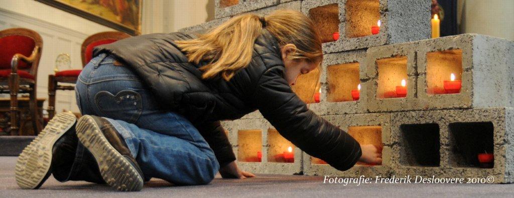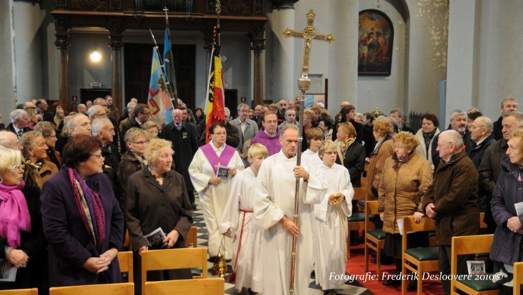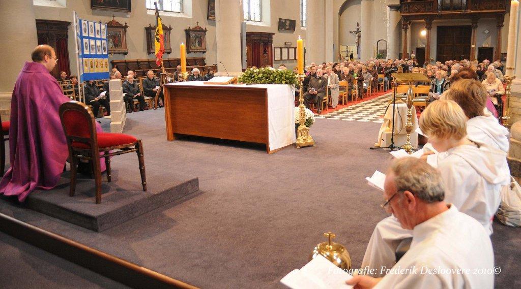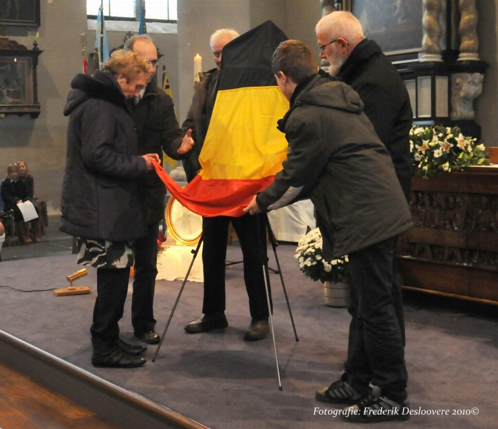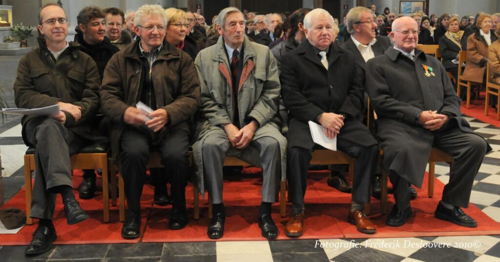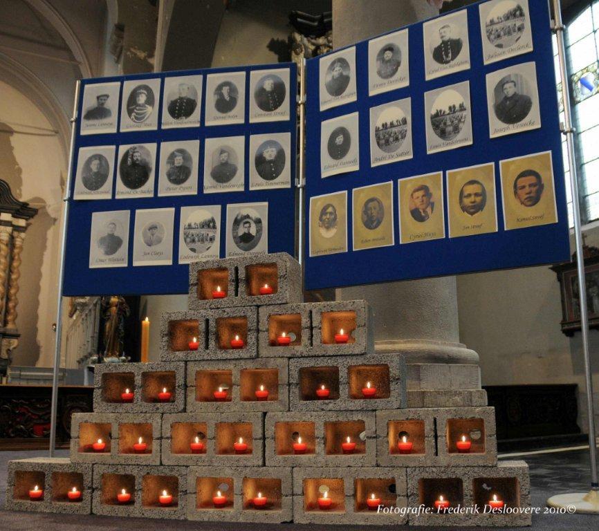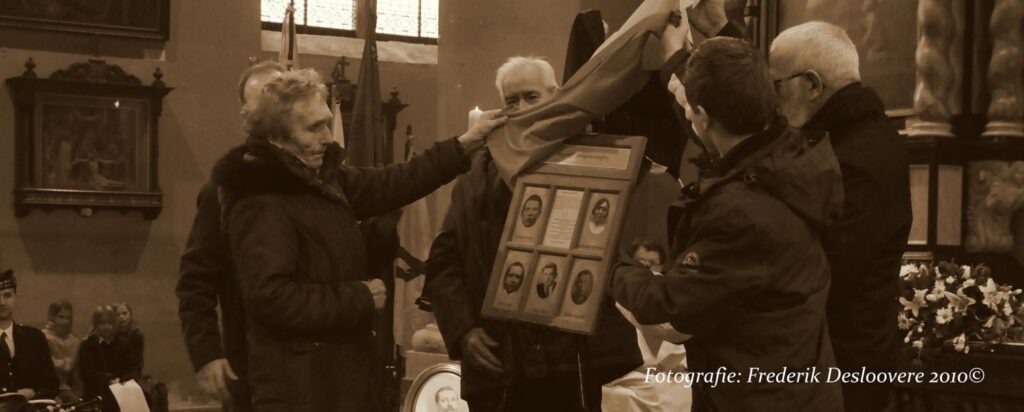 De Dudzeelse burgerlijke oorlogsslachtoffers stonden centraal in deze jubileumviering. Het bedekte houten kader stond voor het altaar. Op de treden stonden de familieleden, afgevaardigden, van de slachtoffers. Tijdens het onthullen van het kader was de ganse wereld even vervat in dat ene moment. Alle aandacht werd omgevormd tot innerlijke stilte en maakte de viering een intense beleving. Even werd de tijd niet gemaakt door de klok. Even hielden we met z’n allen de tijd vast in het Licht van de ervaring van een uitzonderlijk moment. Buiten geselden rukwinden en regens de kerk maar niemand die het merkte. Samen hebben we voor een innig en tijdeloos samenzijn in gemeenschap gezorgd.