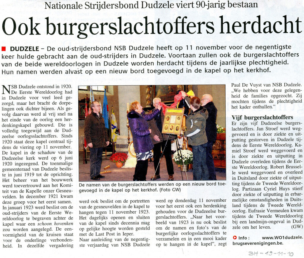 NSB Dudzele ontstond in 1920. De Eerste Wereldoorlog had in Dudzele voor veel leed gezorgd, maar het bracht de dorpelingen ook dichter bijeen. Als gevolg daarvan werd al vrij snel na het einde van de oorlog een herdenkingskapel gebouwd. Die is volledig toegewijd aan de Dudzeelse oorlogsslachtoffers. Sinds 1920 staat deze kapel centraal tijdens de viering op 11 november. De kapel in de schaduw van de Dudzeelse kerk werd op 6 juni 1920 ingezegend. De toenmalige gemeenteraad van Dudzele besliste in juni 1919 tot de oprichting. Het beheer van het bouwwerk werd toevertrouwd aan het Komiteit van de Kapelle onzer Gesneuvelden. In december 1921 kwam deze groep voor het eerst samen. In januari 1923 werd beslist om de oud-strijders van de Eerste Wereldoorlog te begraven achter de kapel waar een schoon hovenken zou worden aangelegd. De eenvormigheid van de kruisen staat voor de onderlinge verbondenheid. In dezelfde vergadering werd ook beslist om de portretten van de gesneuvelden in de kapel te hangen tegen 11 november 1923. Het dagelijks openen en sluiten van de kapel sinds decennia mag op gelijke hoogte worden gesteld met de Last Post in leper. Naar aanleiding van de negentigste verjaardag van NSB Dudzele werd op donderdag 11 november voor het eerst ook een herdenking gehouden voor de Dudzeelse burgerslachtoffers. „Naar het voorbeeld van 1923 is nu ook beslist om de namen en foto’s van de burgerlijke oorlogsslachtoffers te verzamelen en in een mooi kader op te hangen ia de kapel”, zegt Paul De Vuyst van NSB Dudzele. „We hebben voor deze gelegenheid de families opgezocht. Zij mochten tijdens de plechtigheid het kader onthullen.”