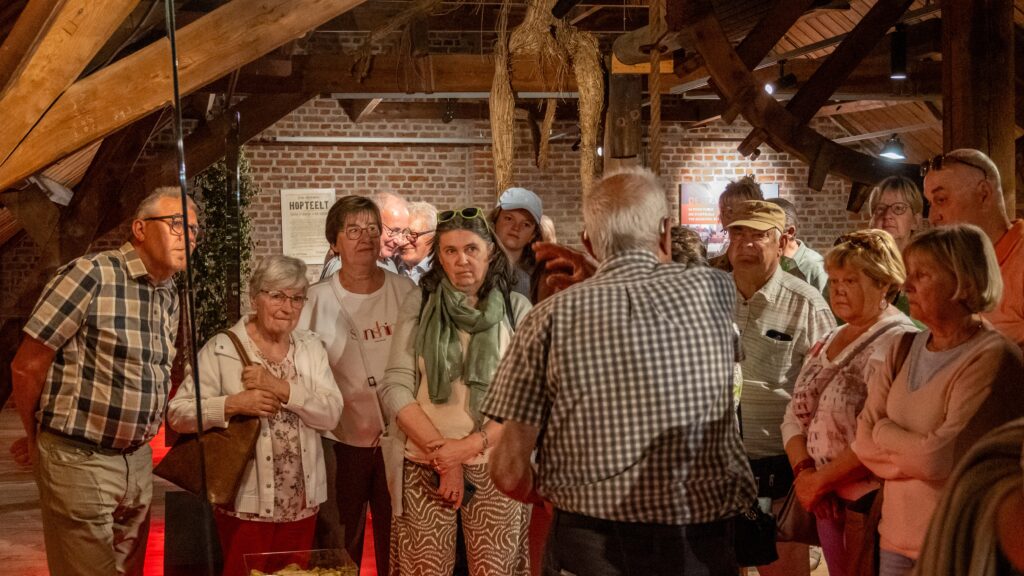 Om 07u vertrekken wij met 59 deelnemers welgemutst en onder een stralende zon richting Poperinge alwaar er een zeer verzorgde ontbijt op ons wacht. Om 09u30 worden wij verwelkomt door 2 gidsen die ons met veel bravoure rondleiden in het Hopmuseum.