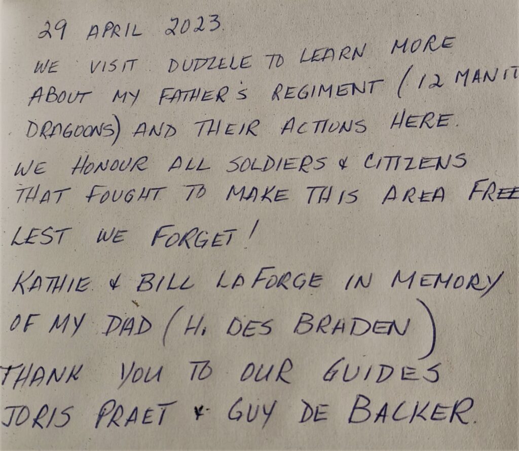 De vader van Kathie was H. Des Braden die tijdens WO II diende bij de Manitoba Dragoons, de bevrijders van o.a Diksmuide, Oostende, Brugge, Dudzele en Blankenberge. Onder de begeleiding van voormalig havenkapitein en dorpsgenoot Joris Praet en de heer Guy De Backer werden Kathie en Bull door de verschillende gemeentebesturen van de bevrijdde steden tijdens september 1944 op eervolle wijze ontvangen. Tijdens deze reisroute hebben zij ook even halt gehouden aan de Gedenkkapel en de daar ter plaatse indertijd genomen foto tijdens de bevrijding van Dudzele. Een mooie tekst in het gedenkboekje in de kapel zorgt voor een blijvende herinnering.